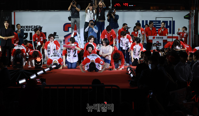 [포토] 큰절로 지지호소 하는 김문수 후보와 선대위