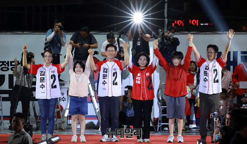 김문수 국민의힘 대선 후보가 제21대 대통령 선거를 하루 앞둔 2일 오후 서울광장에서 열린 피날레 유세에서 가족들과 함께 지지자를 향해 인사하고 있다.