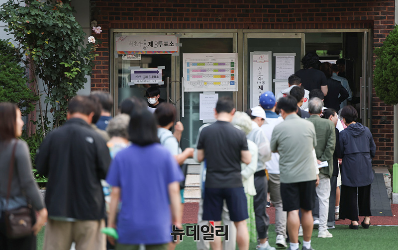 제21대 대통령 선거일인 3일 오전 서울 서초구 원명초등학교에 마련된 투표소에 시민들이 투표하기 위해 줄을 서 있다.
