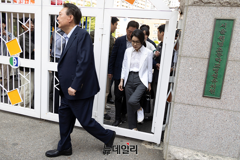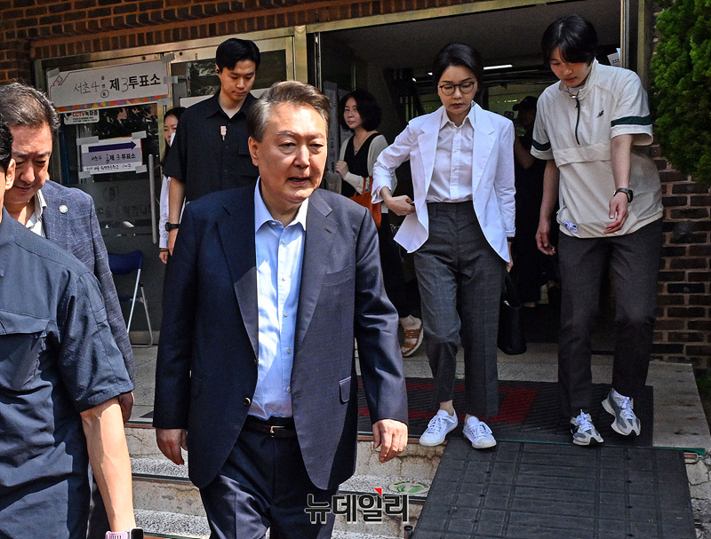 윤석열 전 대통령 부부가 제21대 대통령 선거일인 3일 오전 서울 서초구 원명초등학교에 마련된 투표소에서 투표를 마치고 자리를 나서고 있다.