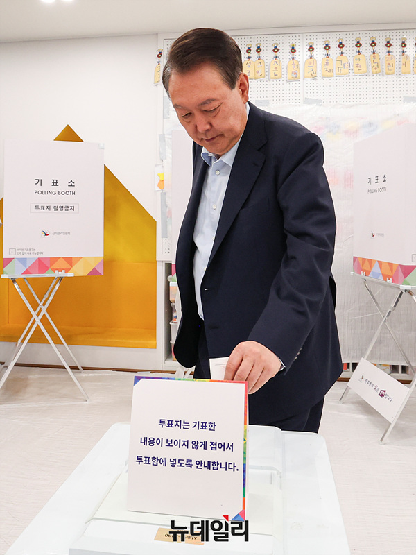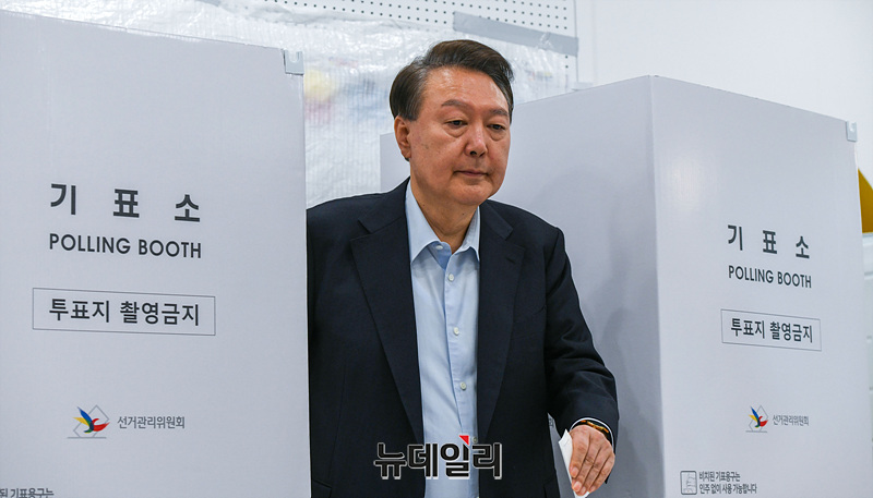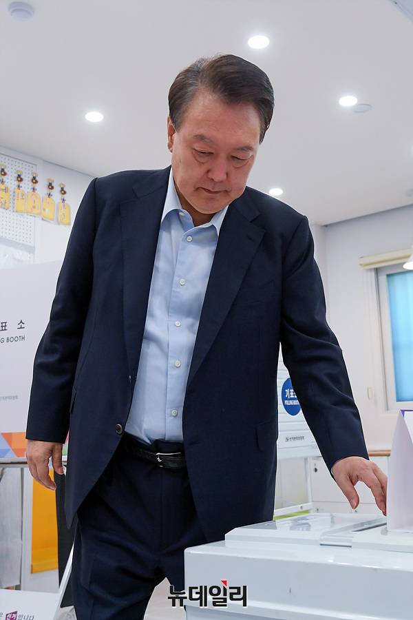윤석열 전 대통령이 제21대 대통령 선거일인 3일 오전 서울 서초구 원명초등학교에 마련된 투표소에서 투표하고 있다.