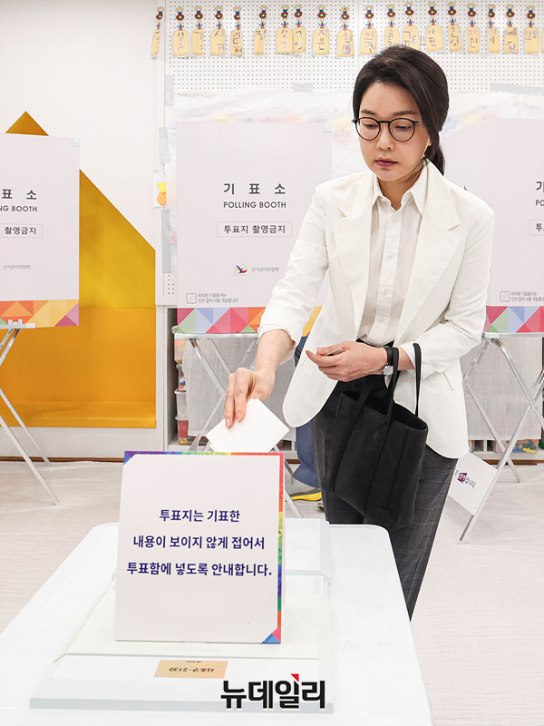 윤석열 전 대통령의 부인 김건희 여사가 제21대 대통령 선거일인 3일 오전 서울 서초구 원명초등학교에 마련된 투표소에서 투표하고 있다.