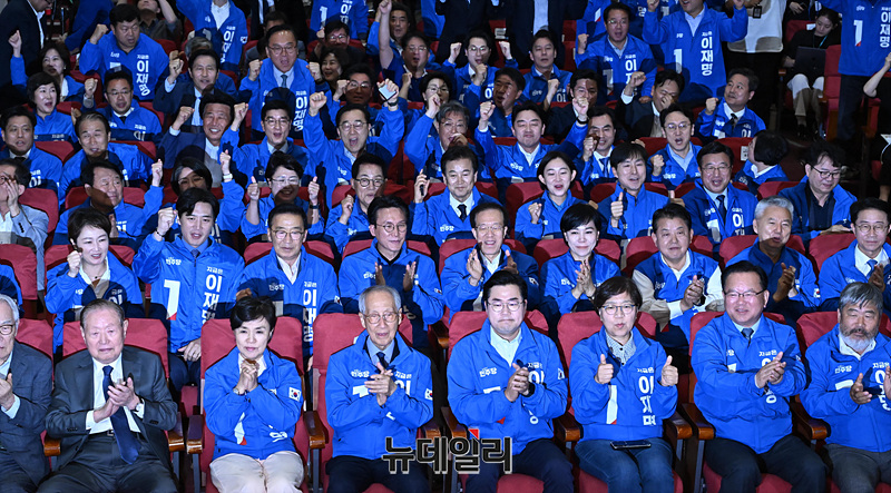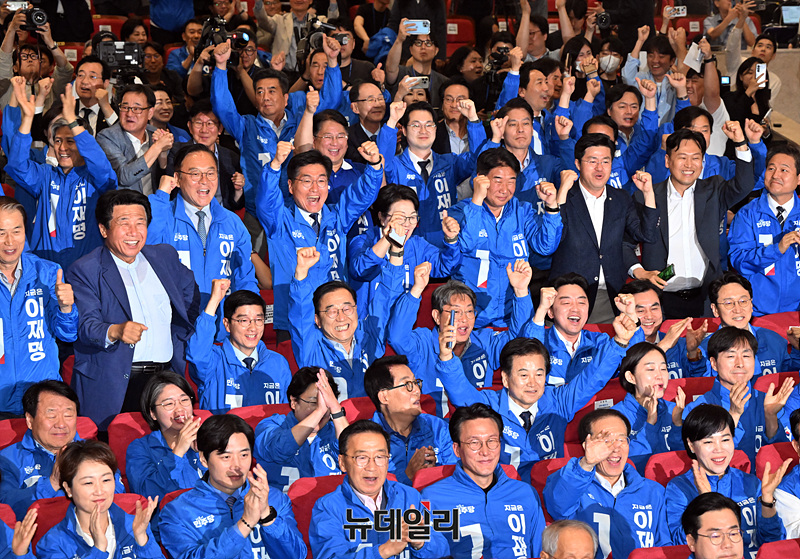 제21대 대통령 선거가 실시된 3일 오후 서울 여의도 국회에 마련된 더불어민주당 개표 상황실에서 윤여준 총괄상임선대위원장, 박찬대 총괄상임선대위원장 등 당직자들이 방송사 출구조사 결과를 확인하며 환호하고 있다.