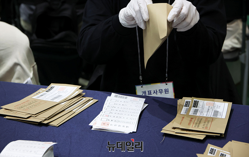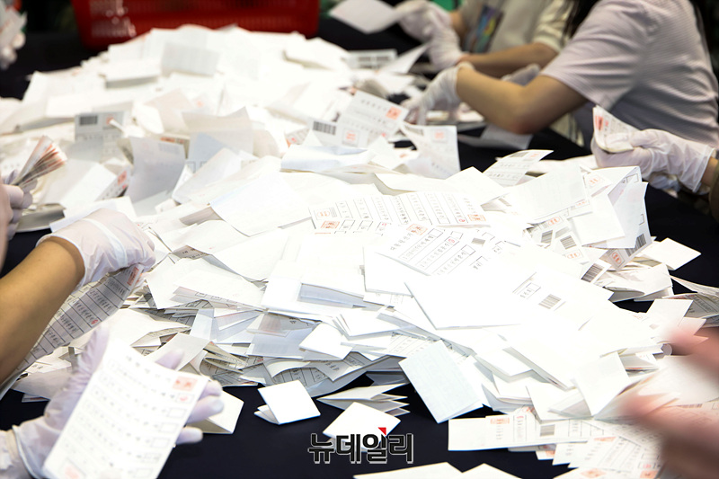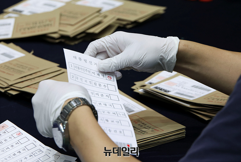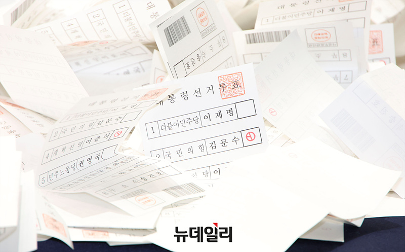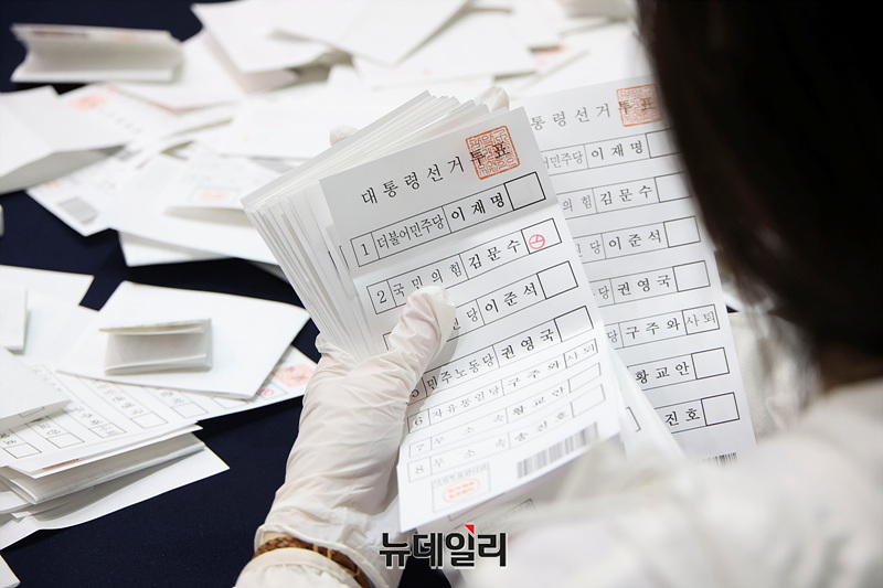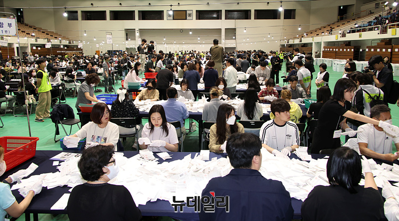 제21대 대통령 선거 투표가 종료된 3일 오후 서울대학교 관악캠퍼스 체육관에 마련된 개표소에서 개표가 진행되고 있다.