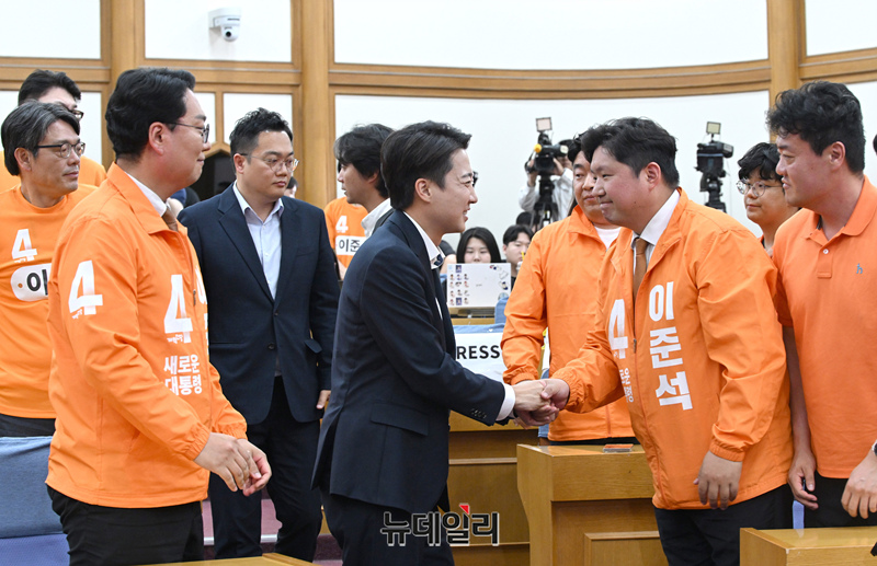 이준석 개혁신당 대선 후보가 3일 오후 방송 3사 출구조사 발표를 확인한 뒤 국회 의원회관에 마련된 당 개표상황실에 방문해 소감을 말한 뒤 당원들과 인사하고 있다.
