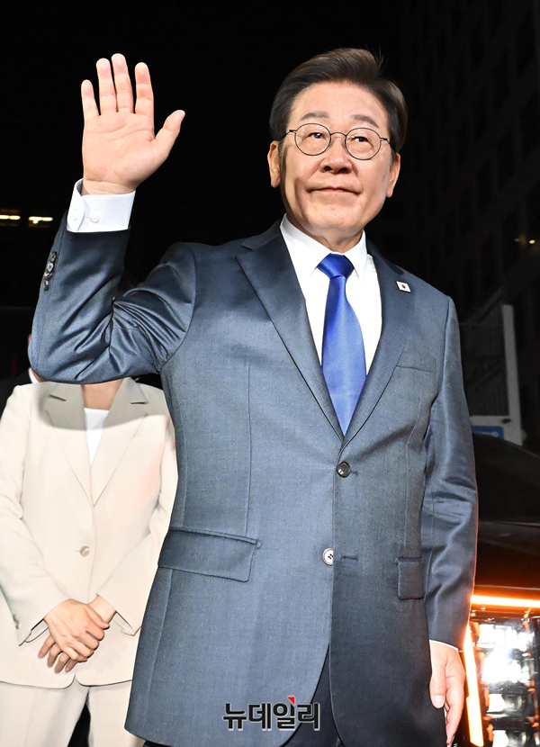 이재명 더불어민주당 대통령 후보가 당선이 확실시된 가운데 4일 오전 서울 여의도 더불어민주당 중앙당사에 들어서며 손을 흔들고 있다.