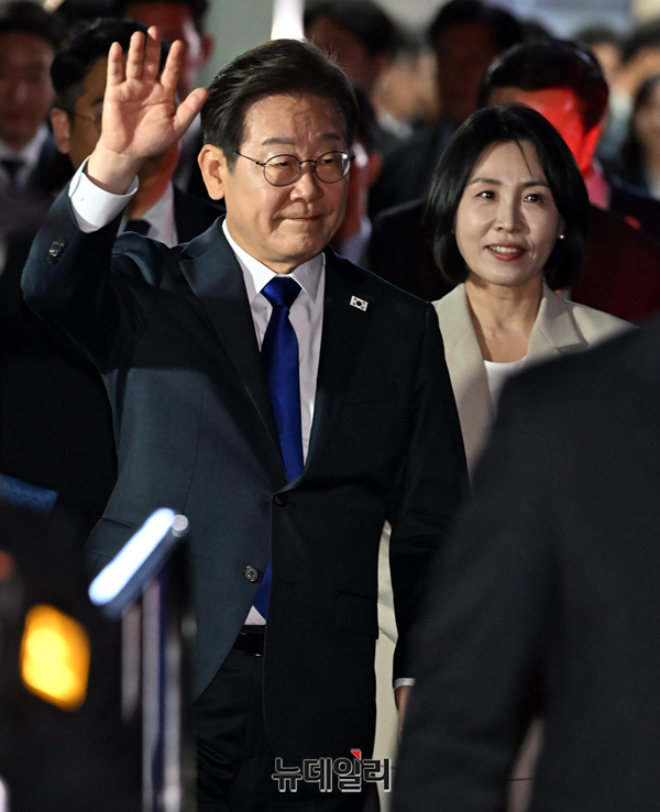 이재명 더불어민주당 대통령 후보가 당선이 확실시된 가운데 4일 오전 서울 여의도 더불어민주당 중앙당사를 떠나고 있다.