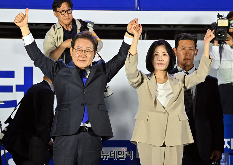 이재명 대통령 후보가 당선이 확실시된 후 4일 오전 국회 앞에 마련된 더불어민주당의 국민개표방송 시청 현장에서 배우자 김혜경 여사와 손을 들어 지지자들에게 인사를 하고 있다.