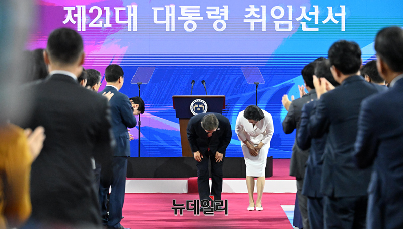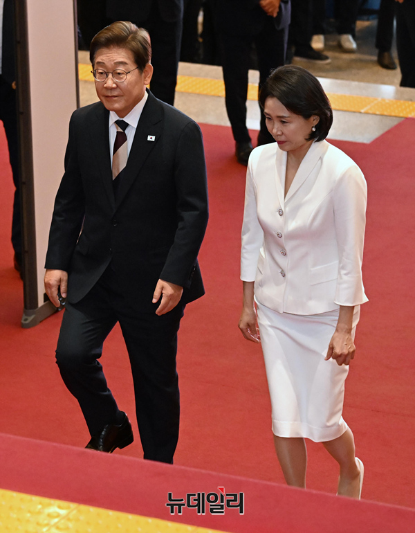 이재명 대통령이 4일 서울 여의도 국회에서 열린 제21대 대통령 취임선서식에서 부인 김혜경 여사와 입장하고 있다.