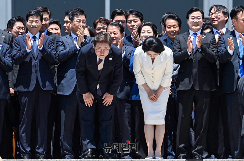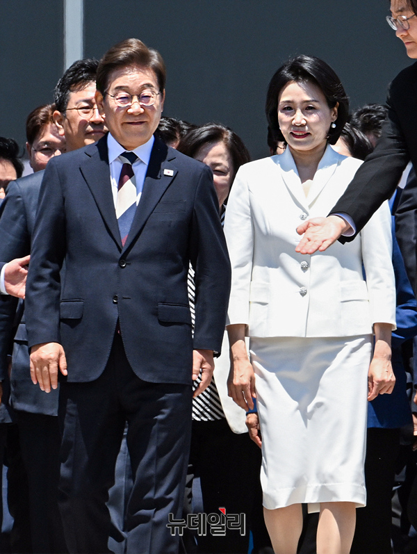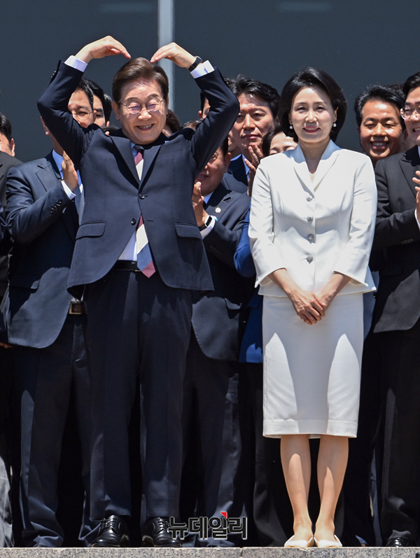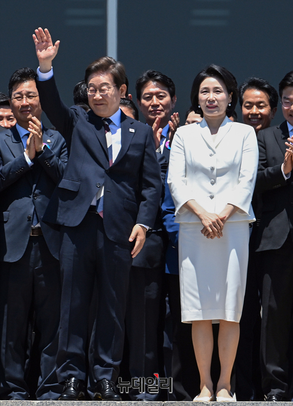 이재명 대통령이 4일 서울 여의도 국회에서 열린 제21대 대통령 취임선서식을 마치고 부인 김혜경 여사와 인사를 하고 있다.