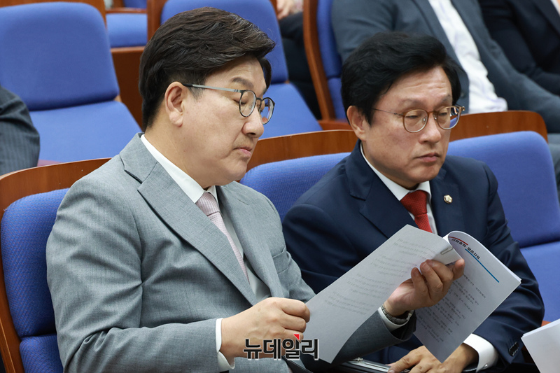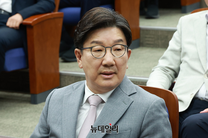 권성동 국민의힘 원내대표가 5일 오전 국회에서 열린 의원총회에 참석해 앉아 있다.
