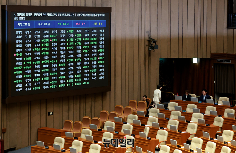 김건희와 명태균-건진법사 관련 국정농단 및 불법 선거 개입 사건 등 진상규명을 위한 특별검사 임명 등에 관한 법률안이 5일 국회에서 열린 본회의를 통과하고 있다.