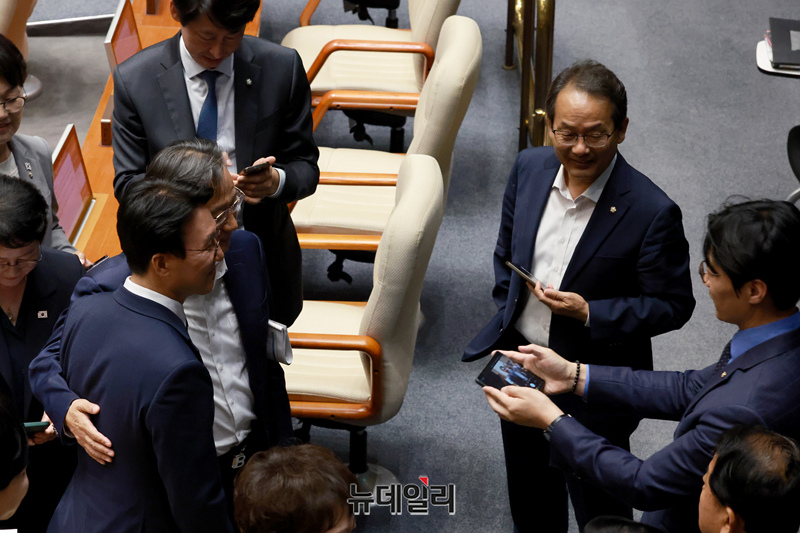 국무총리 후보자인 김민석 더불어민주당 의원이 5일 국회에서 열린 본회의에서 같은 당 의원들과 기념촬영을 하고 있다.