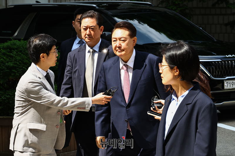 윤석열 전 대통령이 9일 오전 서울 서초구 서울중앙지방법원에서 열린 내란 우두머리 협의 · 직권남용 권리행사 방해 혐의 사건 6차 공판에 출석하고 있다. (사진=공동취재단)