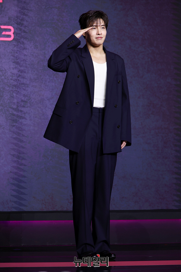 배우 강하늘이 9일 오전 서울 용산구 드래곤시티에서 열린 넷플릭스 시리즈 '오징어 게임 시즌 3' 제작발표회에서 포즈를 취하고 있다.