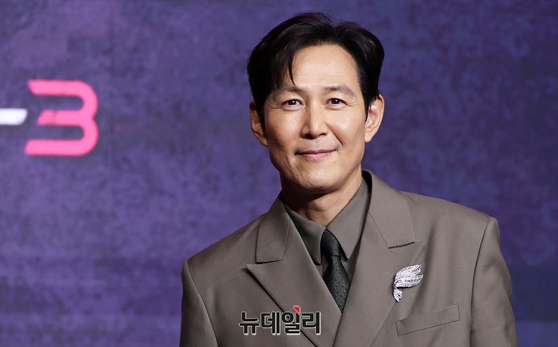 배우 이정재가 9일 오전 서울 용산구 드래곤시티에서 열린 넷플릭스 시리즈 '오징어 게임 시즌 3' 제작발표회에서 포즈를 취하고 있다.
