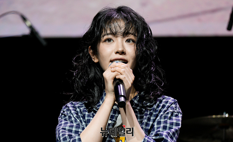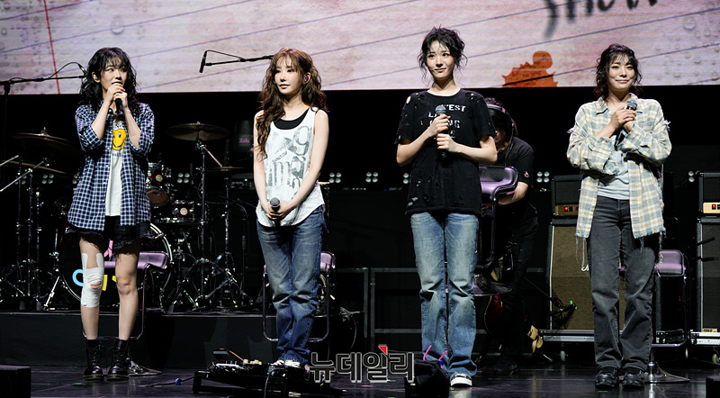 걸밴드 QWER 쵸단, 마젠타, 히나, 시연이 9일 오후 서울 마포구 예스24 원더로크홀에서 열린 QWER 미니 3집 발매 기념 미디어 쇼케이스에서 소감을 밝히고 있다.