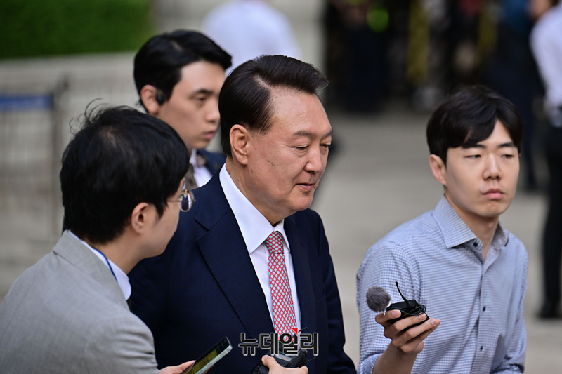 윤석열 전 대통령이 9일 오후 서울 서초구 서울중앙지방법원에서 열린 내란 우두머리 혐의, 직권남용 권리행사방해 혐의 사건 6차 공판을 마친 후 취재진의 질문을 받으며 법원을 나서고 있다. (사진=공동취재단)
