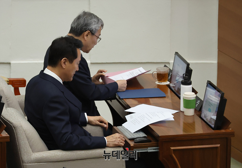 오세훈 서울시장과 정근식 서울교육감이 10일 오후 서울 중구 서울시의회 본회의장에서 제331회 정례회 개회식을 앞두고 대화를 나누고 있다.