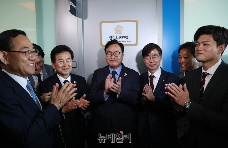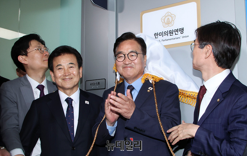 우원식 국회의장(가운데), 주호영 국회부의장을 비롯한 참석자들이 12일 오전 국회 소통관에서 열린 한미의원연맹 현판식에 참석해 자리하고 있다.