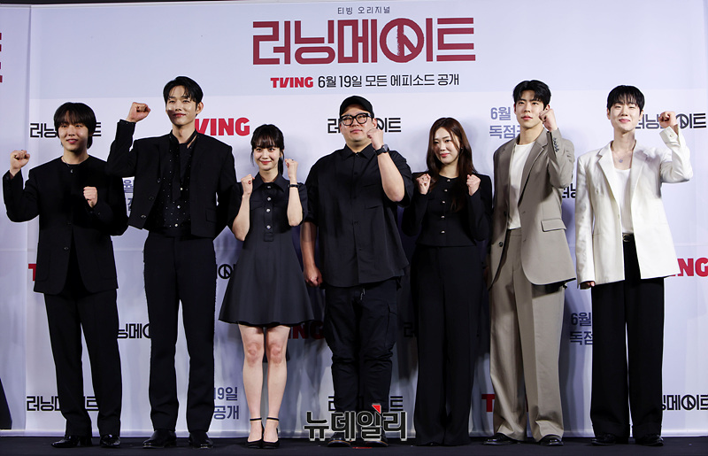 배우 윤현수, 이정식, 홍화연, 한진원 감독, 김지우, 최우성, 이봉준이 12일 오후 서울 마포구 스텐포드호텔에서 열린 티빙 오리지널 '러닝메이트' 제작발표회에서 포즈를 취하고 있다.