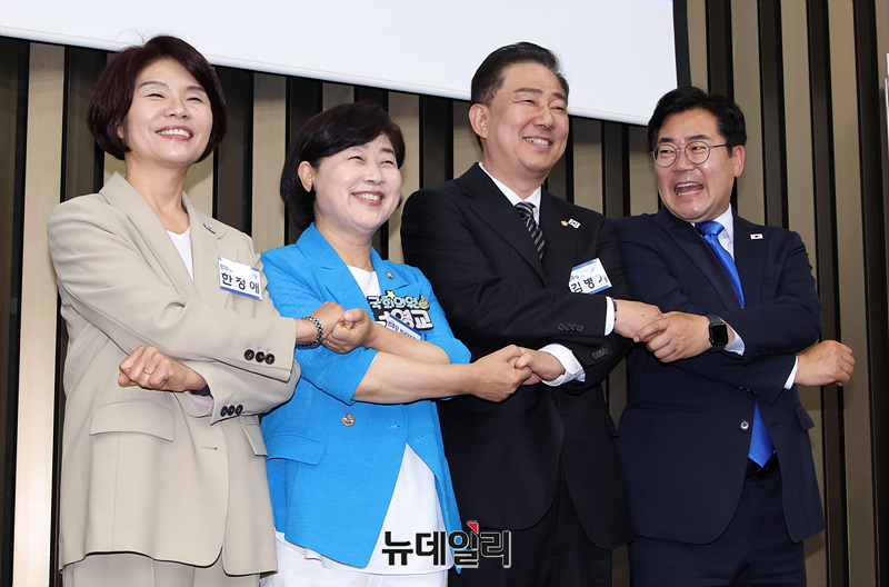 한정애 더불어민주당 선관위원장, 김병기, 서영교 원내대표 후보, 박찬대 당대표 직무대행이 13일 오후 국회에서 열린 제2기 원내대표 선출 의원총회에서 기념촬영을 하고 있다.