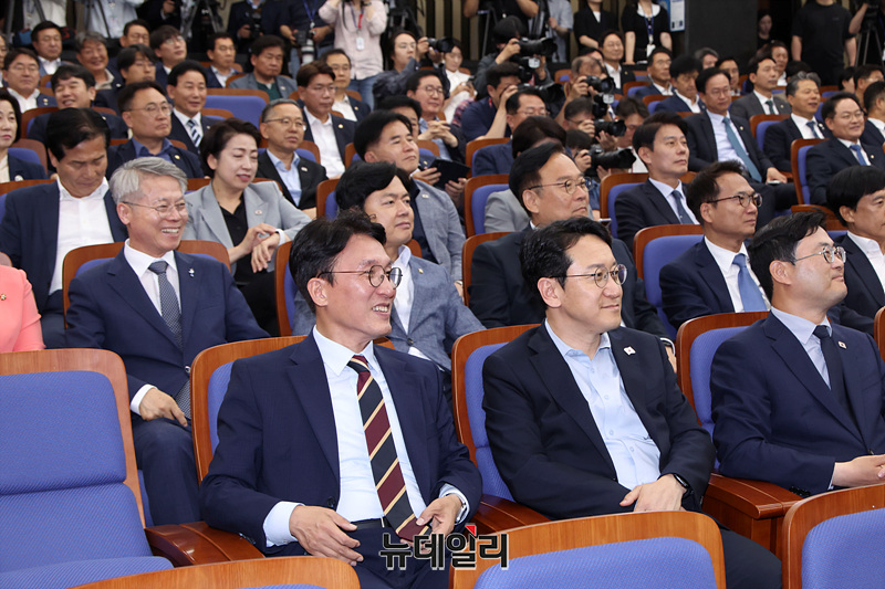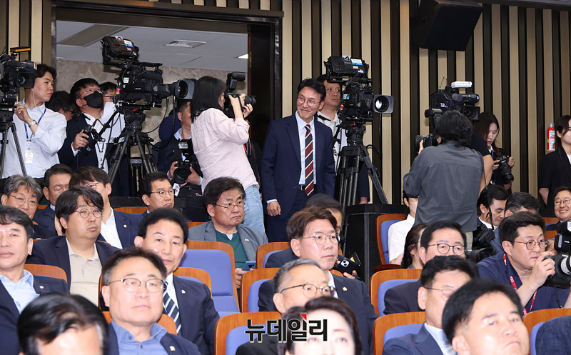 김민석 국무총리 후보자가 13일 오후 국회에서 열린 더불어민주당 제2기 원내대표 선출 의원총회에 참석해 자리하고 있다.