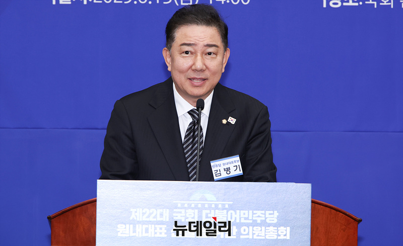 김병기 더불어민주당 신임 원내대표가 13일 오후 국회에서 열린 제2기 원내대표 선출 의원총회에서 수락연설을 하고 있다.