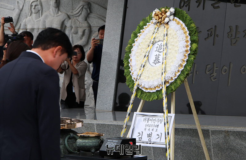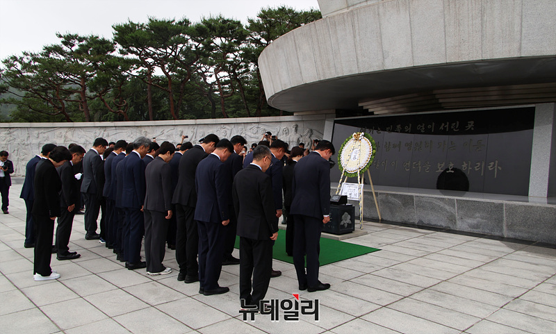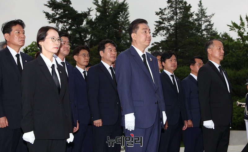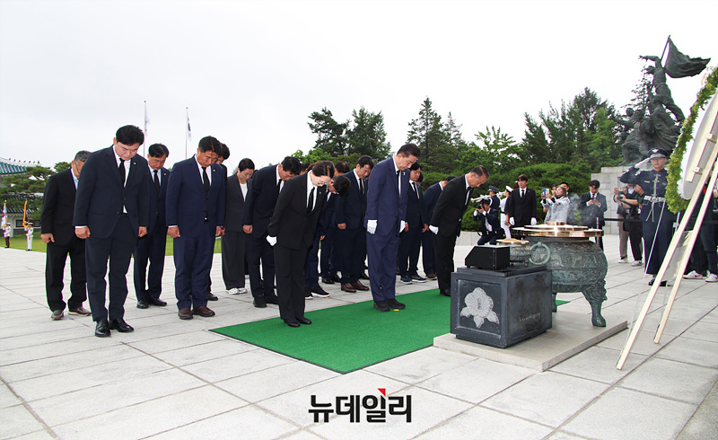 김병기 더불어민주당 당대표 직무대행 겸 원내대표와 원내지도부가 16일 오전 서울 동작구 국립서울현충원 현충탑에서 참배하고 있다.