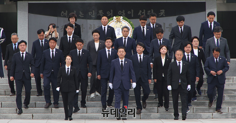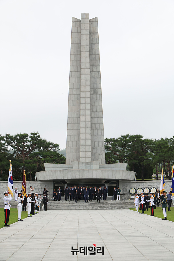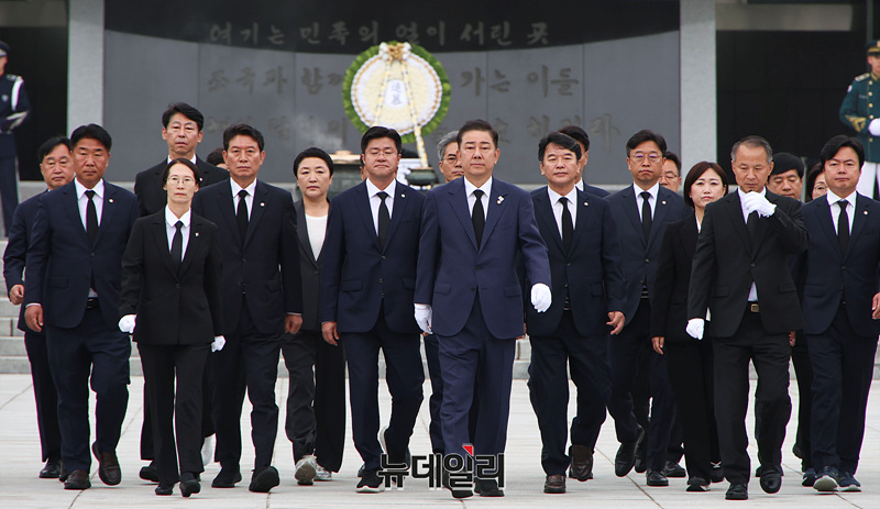 김병기 더불어민주당 당대표 직무대행 겸 원내대표와 원내지도부가 16일 오전 서울 동작구 국립서울현충원 현충탑에서 참배를 마치고 자리를 나서고 있다.