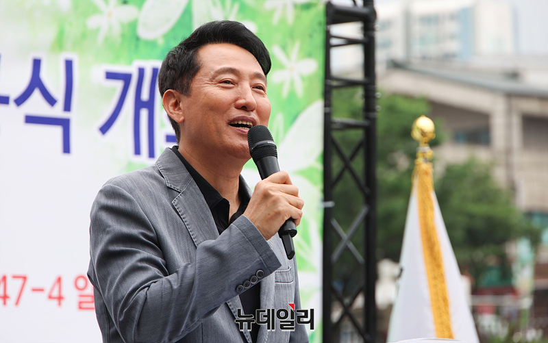 오세 서울시장이 16일 오전 서울 강북구 우이천에서 열린 '우이천 수변활력거점 조성사업' 준공식에서 축사를 하고 있다.