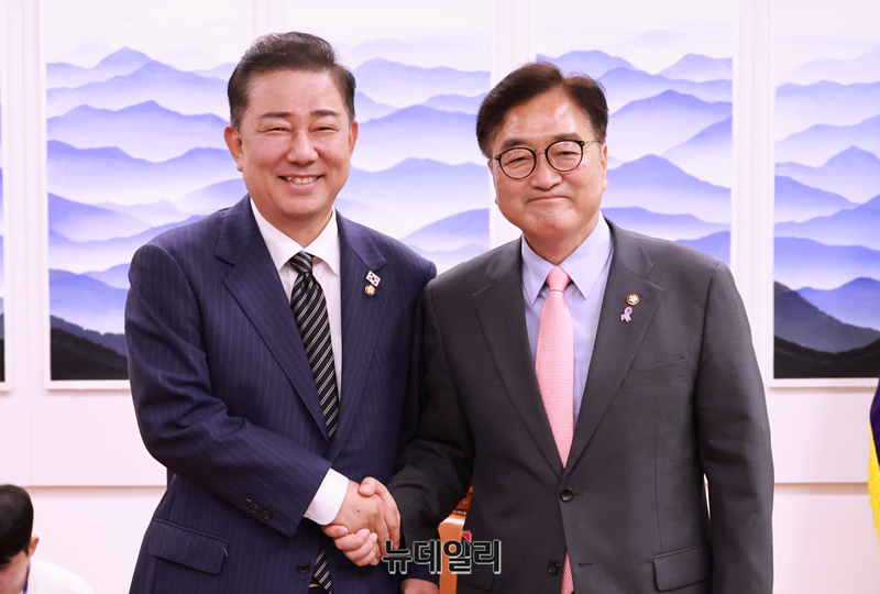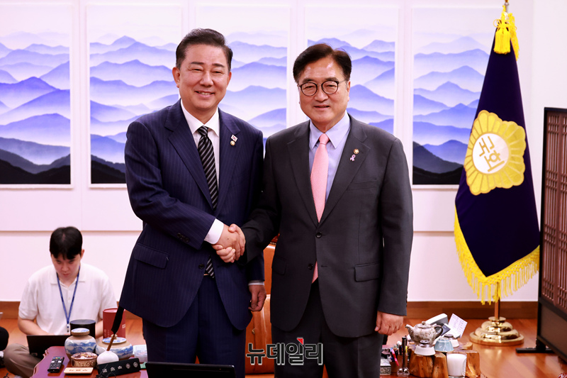 우원식 국회의장이 16일 오전 국회 의장실을 예방한 김병기 더불어민주당 신임 원내대표와 기념촬영을 하고 있다.