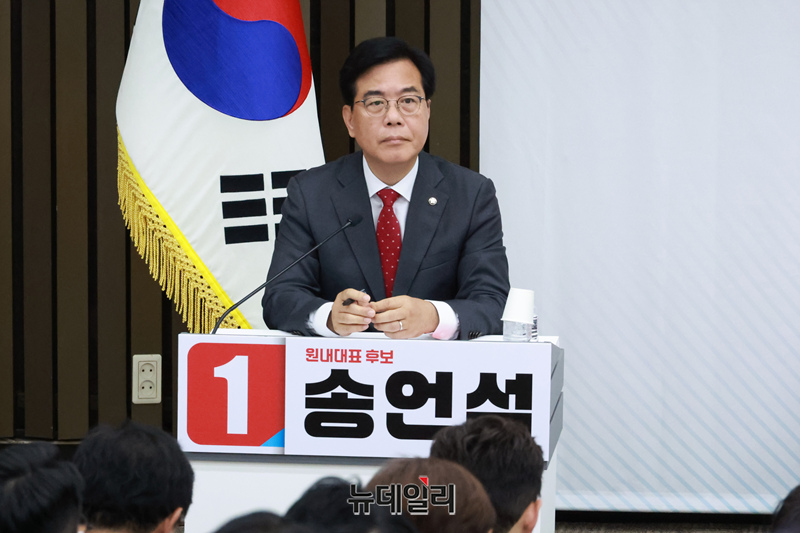 국민의힘 원내대표 선거에 출마한 송언석, 이헌승, 김성원 의원이 16일 국회에서 열린 원내대표 선출을 위한 의원총회에 토론을 하고 있다.