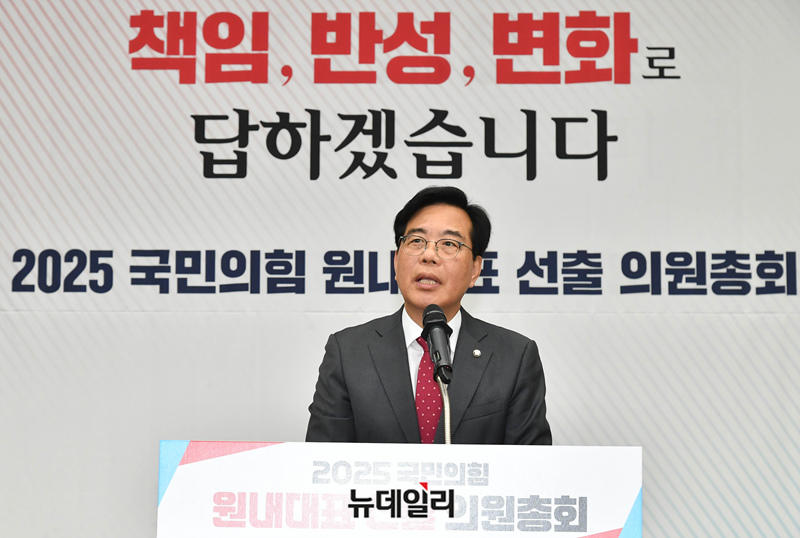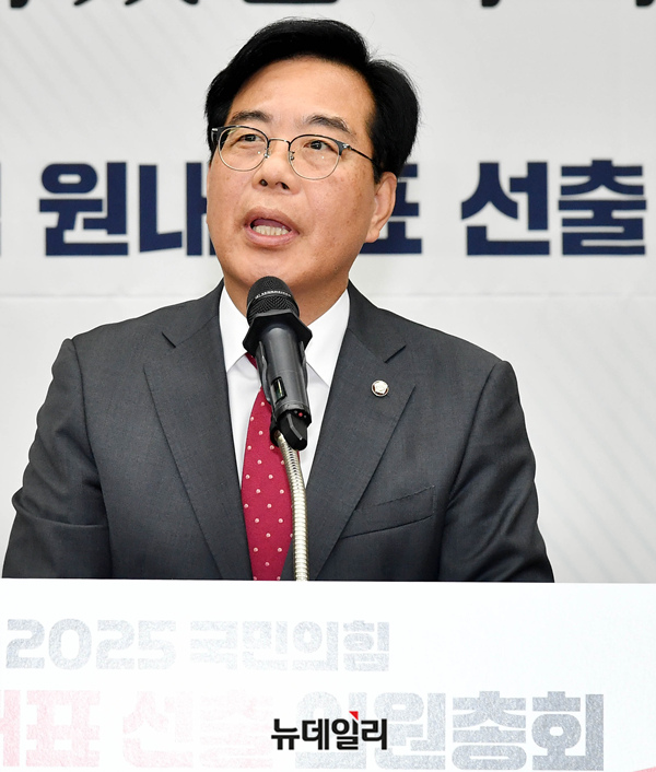 송언석 국민의힘 신임 원내대표가 16일 국회에서 열린 2025 국민의힘 원내대표 선출 의원총회에 수락연설을 하고 있다.
