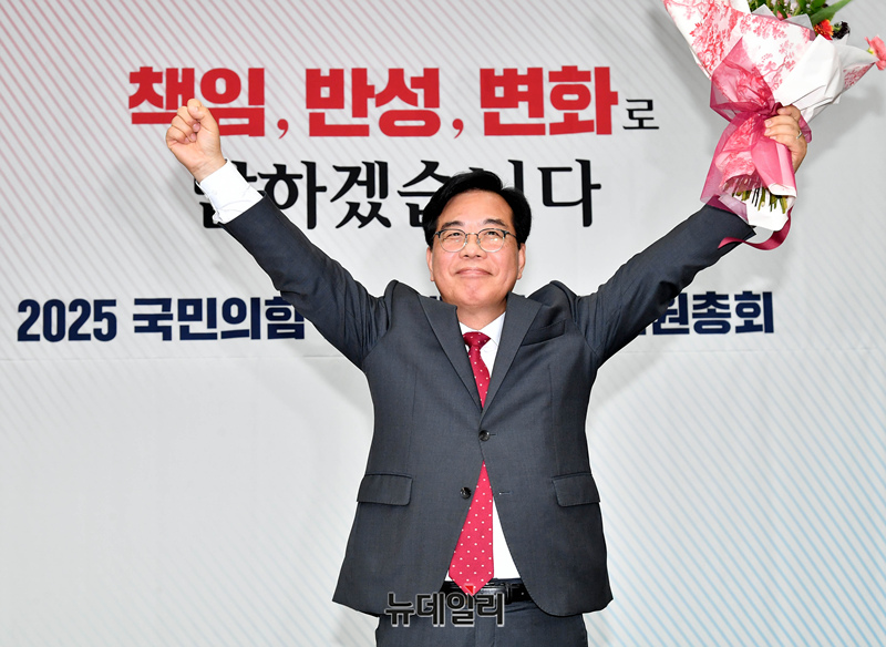송언석 국민의힘 신임 원내대표가 16일 국회에서 열린 2025 국민의힘 원내대표 선출 의원총회에 손을 들어 인사를 하고 있다.