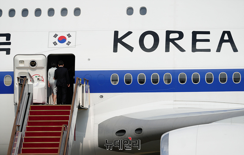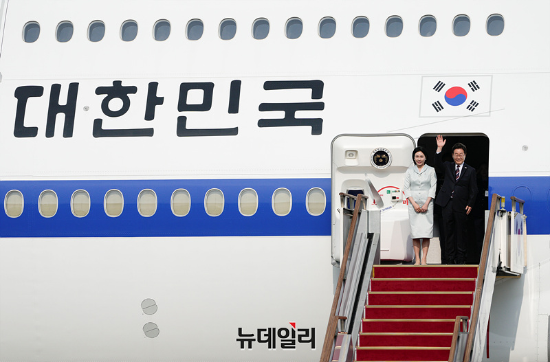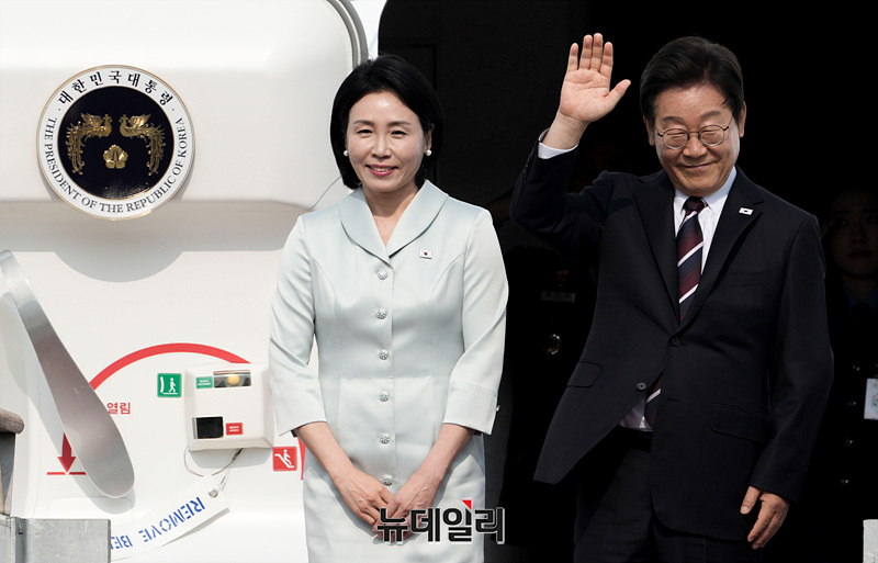 주요 7개국(G7) 정상회의에 참석하는 이재명 대통령이 16일 오후 경기 성남시 서울공항에서 김혜경 여사와 함께 공군 1호기에 탑승하며 인사하고 있다. (경기 성남=서성진 기자)