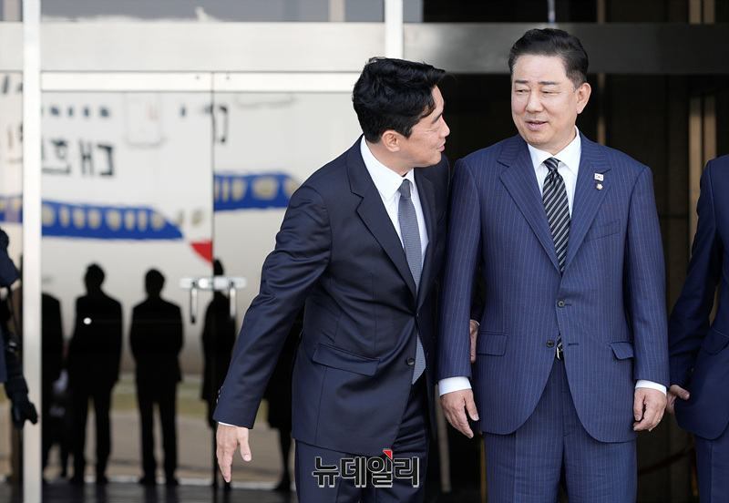 강훈식 대통령 비서실장, 김병기 더불어민주당 원내대표, 우상호 정무수석이 16일 오후 경기 성남시 서울공항에서 주요 7개국(G7) 정상회의에 참석하는 이재명 대통령을 환송하며 대화를 나누고 있다.