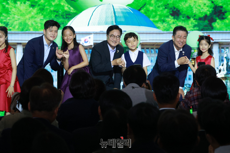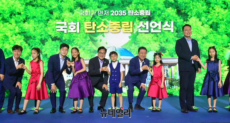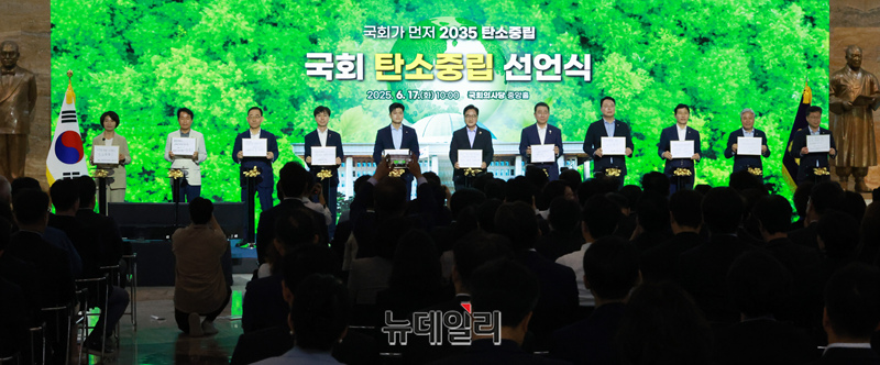 우원식 국회의장과 김병기 더불어민주당 대표 직무대행 겸 원내대표, 김용태 국민의힘 비상대책위원장이 17일 국회에서 열린 탄소 중립 선언식에서 메세지를 남기고 있다.