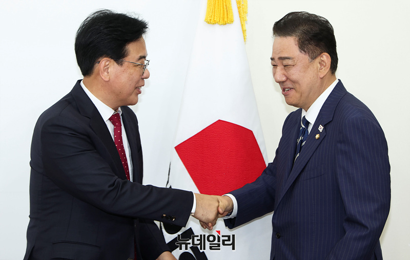 송언석 국민의힘 신임 원내대표와 김병기 더불어민주당 신임 원내대표가 17일 오후 국회에서 악수를 나누고 있다.