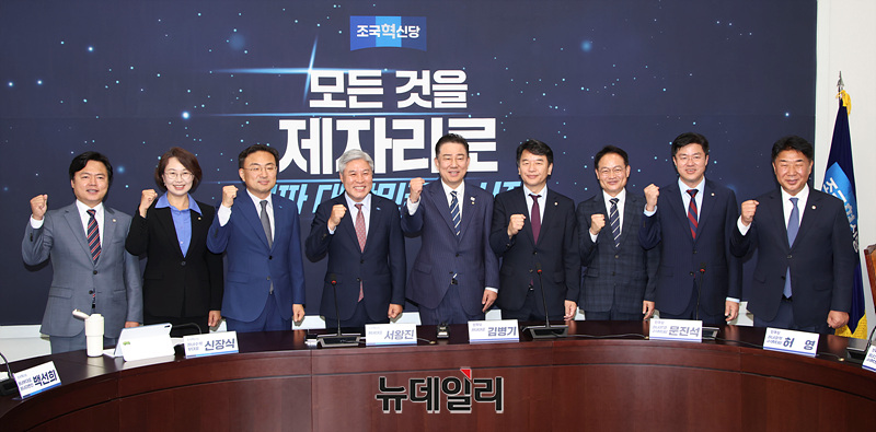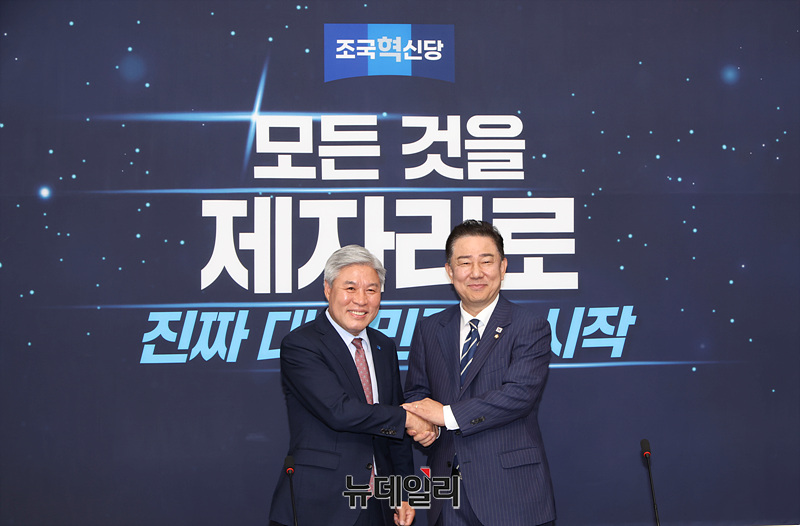 김병기 더불어민주당 신임 원내대표와 서왕진 조국혁신당 원내대표가 17일 오후 국회에서 기념촬영을 하고 있다.