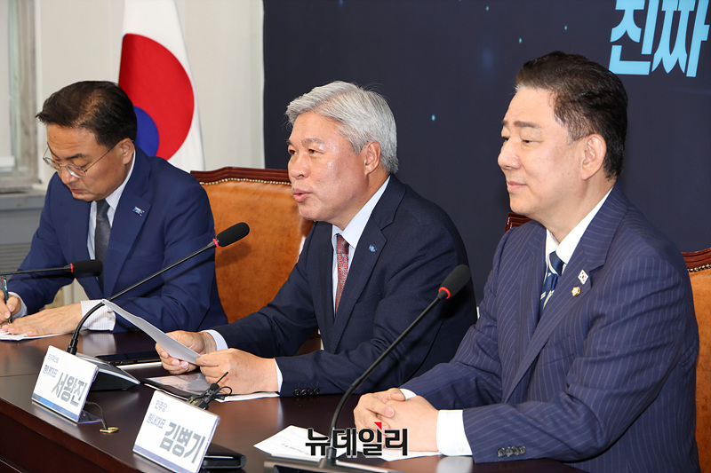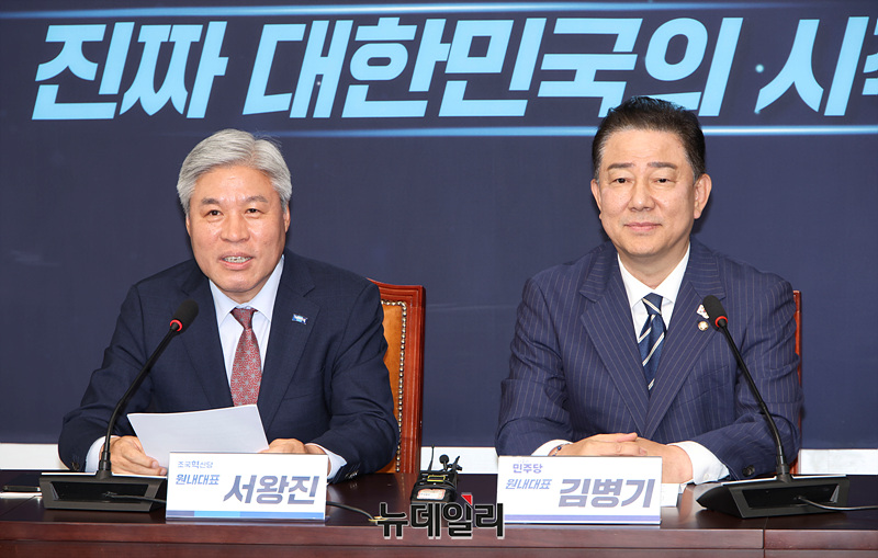 서왕진 조국혁신당 원내대표가 17일 오후 국회에서 김병기 더불어민주당 신임 원내대표를 접견하며 모두발언을 하고 있다.