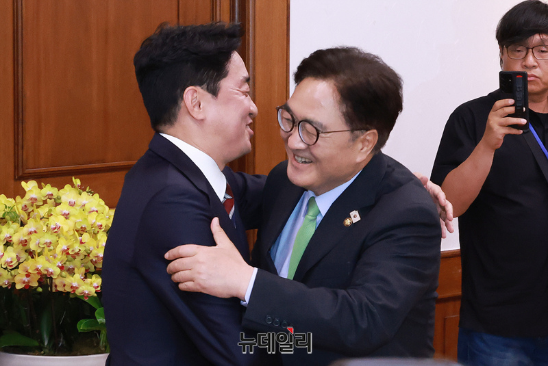[포토] 포옹하는 우원식 국회이장과 강훈식 대통령 비서실장