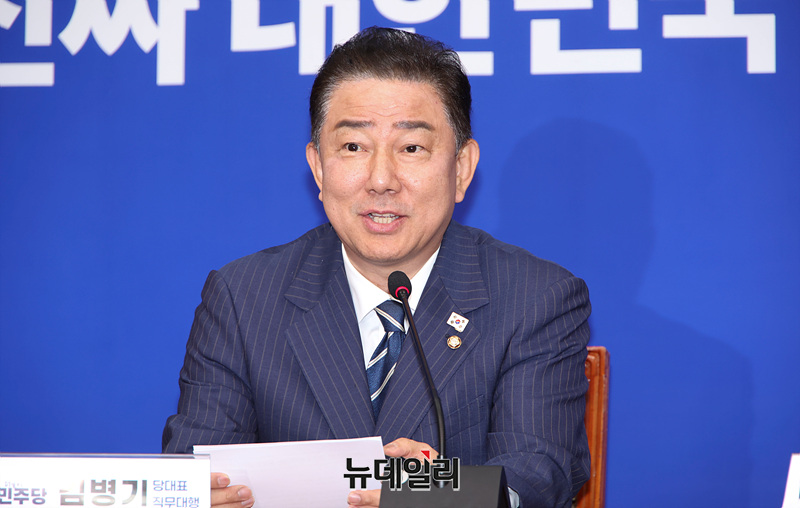 김병기 더불어민주당 신임 원내대표가 17일 오후 국회에서 강훈식 대통령 비서실장과 우상호 정무수석을 접견하며 모두발언을 하고 있다.