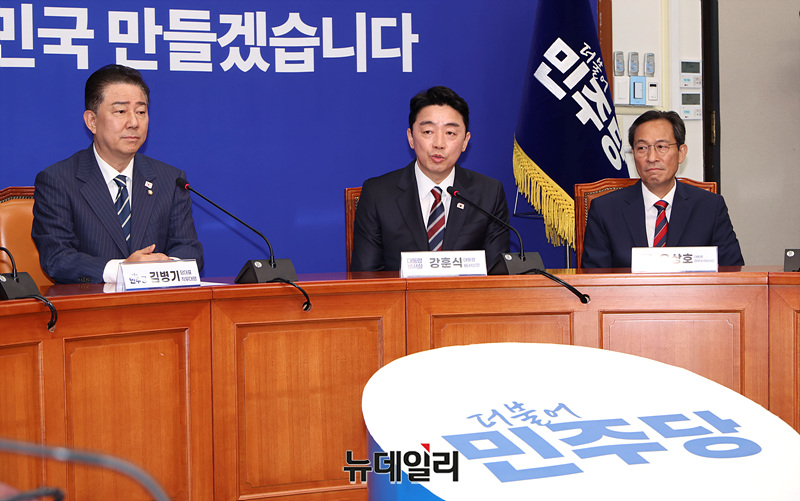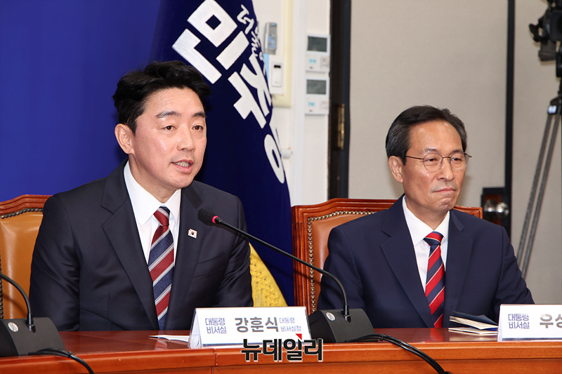 강훈식 대통령 비서실장이 17일 오후 국회에서 김병기 더불어민주당 신임 원내대표를 예방하며 모두발언을 하고 있다.