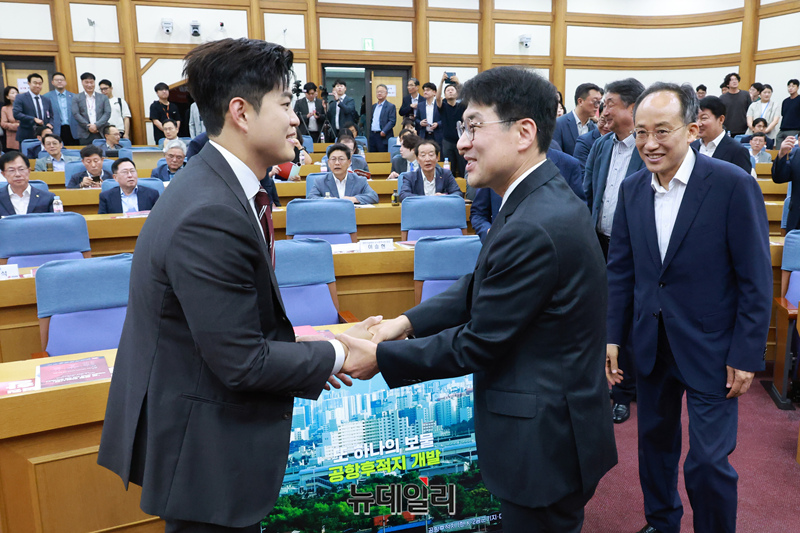김용태 국민의힘 비상대책위원장이 18일 국회 의원회관에서 열린 '군 공항 이전사업' 국정과제 채택을 위한 국회 정책세미나에서 참석자들과 인사를 나누고 있다.
