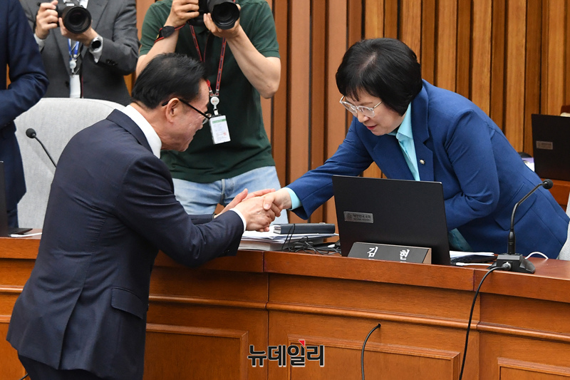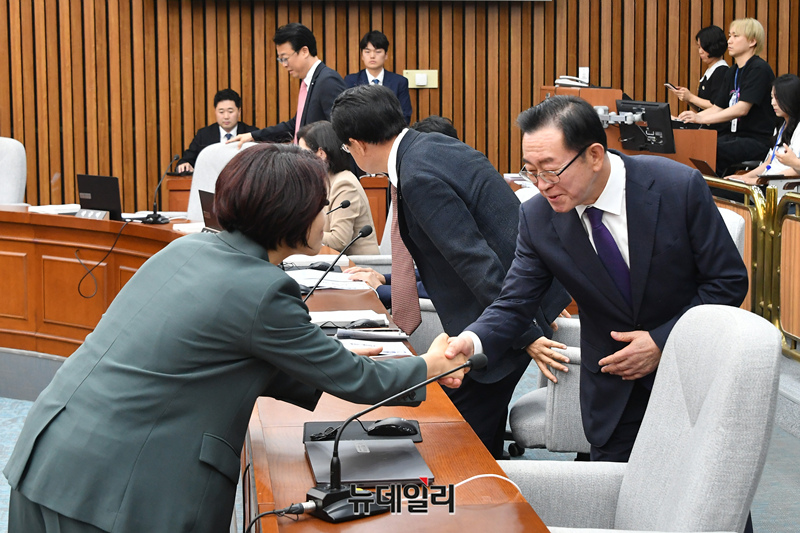 이종배 위원장이 18일 국회에서 열린 국무총리 임명 동의에 관한 인사청문특별위원회 회의에서 더불어민주당 의원들과 인사를 나누고 있다.