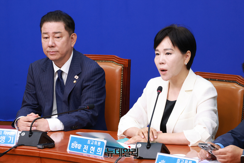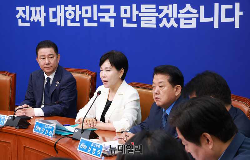 전현희 더불어민주당 최고위원이 23일 오전 국회에서 열린 최고위원회의에 참석해 발언을 하고 있다.