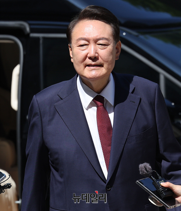 윤석열 전 대통령이 23일 서울 서초구 서울중앙지방법원에서 열린 내란 우두머리 혐의·직권남용 권리행사 방해 혐의 사건 8차 공판에 출석하고 있다. (사진=공동취재단)