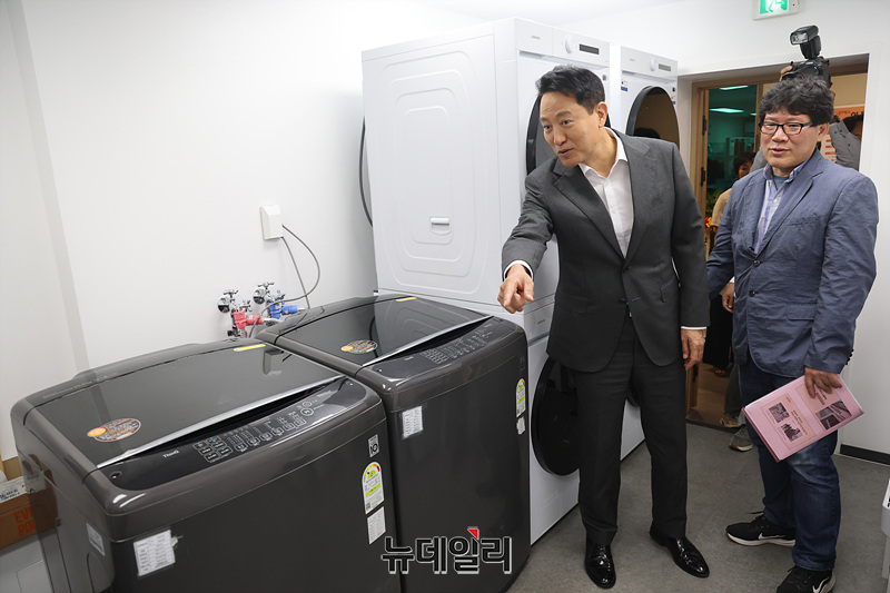 오세훈 서울시장이 23일 오전 서울 영등포구 쪽방상담소에서 열린 온기창고 개소식에서 온기창고를 둘러보고 있다.