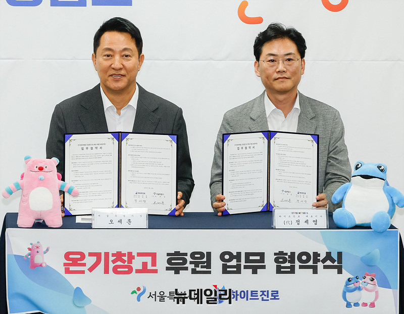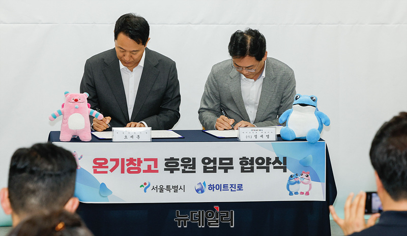 오세훈 서울시장이 23일 오전 서울 영등포구 쪽방상담소에서 열린 온기창고 개소식에서 하이트진로와 업무협약을 하고 있다.